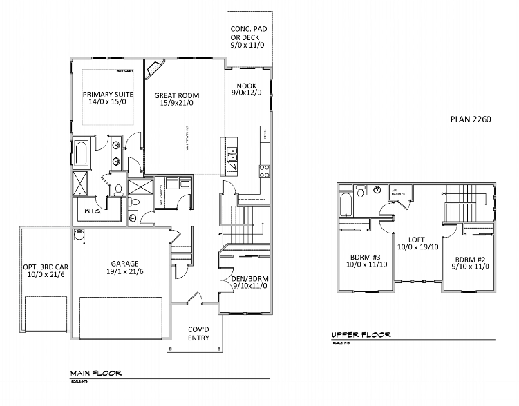 A brilliantly crafted master on main home, The 2260 Plan boasts a large master suite on the main floor, soaking tub and walk in closet.