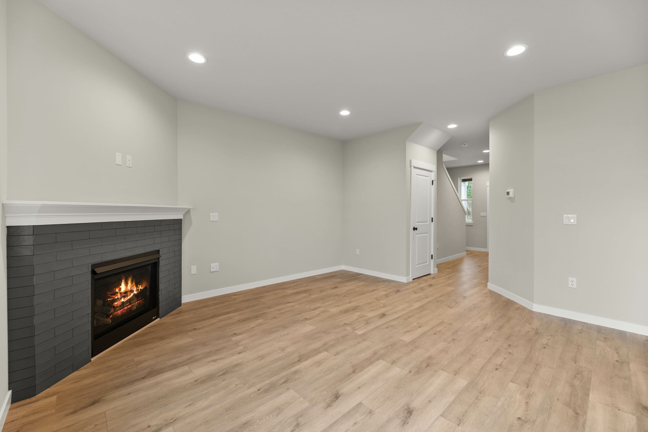 The open-concept family room invites relaxation, with a cozy fireplace perfect for gathering. Optional built-in shelves provide additional storage and style, while an under-stair niche offers a playful hideaway for kids or a cozy pet retreat.