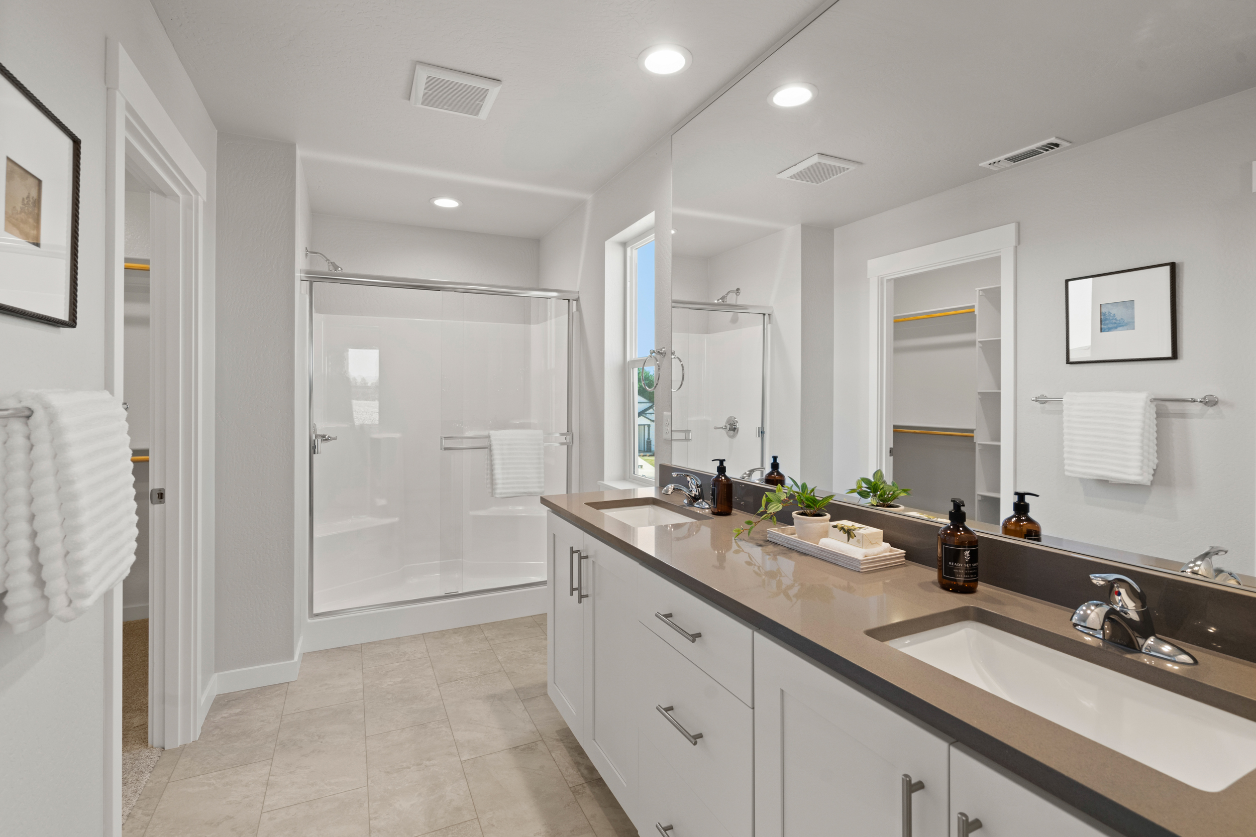 A thoughtfully designed secondary bathroom features a separation wall and a double sink vanity, allowing multiple family members to get ready at the same time—perfect for streamlining busy mornings and evening routines.