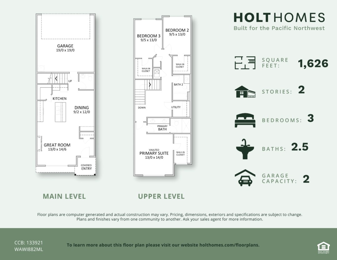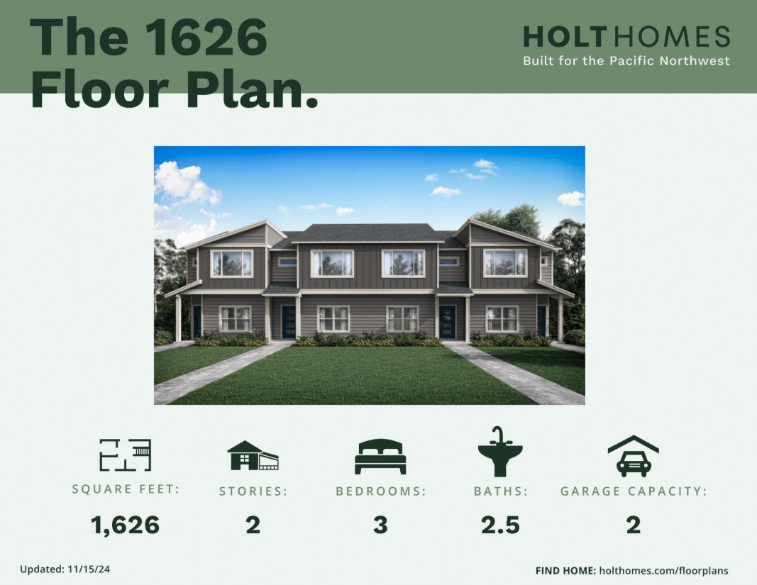 This two-story 1,626 square foot home features three bedrooms, two and one-half bathrooms and top quality finishes from Holt Homes.