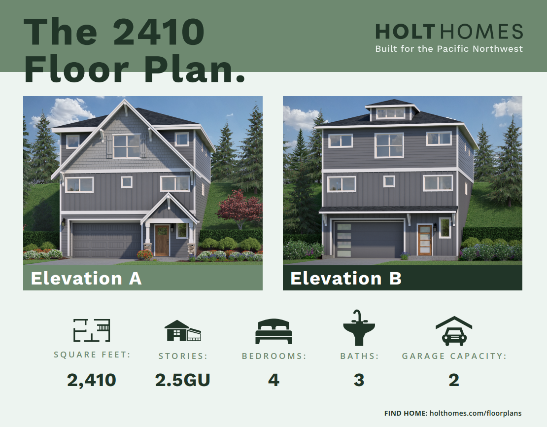 A truly unique home design! The 2410 is a smart, 3-story plan with a 2-bay garage and storage space on the first level. When you arrive home, you can head up to the main floor and be invited in by an open great room with fireplace and connecting dining nook which leads outside to a covered patio. The generous kitchen with separate island leads to a massive walk-in pantry – a dream for those who love to cook! You’ll also find a guest suite on the main floor, perfect for overnight visitors or live-in relatives. On the third level, space is maximized with a full laundry room, two large secondary bedrooms, and luxurious primary suite with soaking tub and amazing walk-in closet.